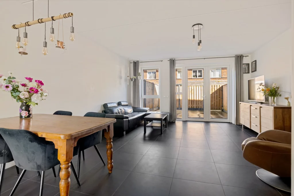 De woonkamer bevindt zich aan de achterzijde van de woning en is tuingericht. Dankzij de grote raampartijen en openslaande deur naar de achtertuin is dit een heerlijke lichte leefruimte. Hier heb je voldoende ruimte voor een comfortabele zithoek en een eethoek.